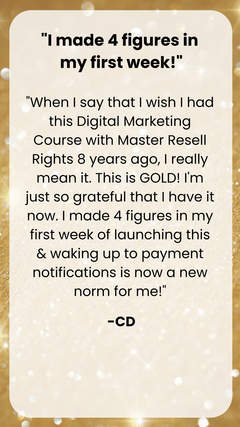"When I say that I wish I had this Digital Marketing Course with Master Resell Rights 8 years ago, I really mean it. This is GOLD! I'm just so grateful that I have it now. I made 4 figures in my first week of launching this & waking up to payment notifications is now a new norm for me!"