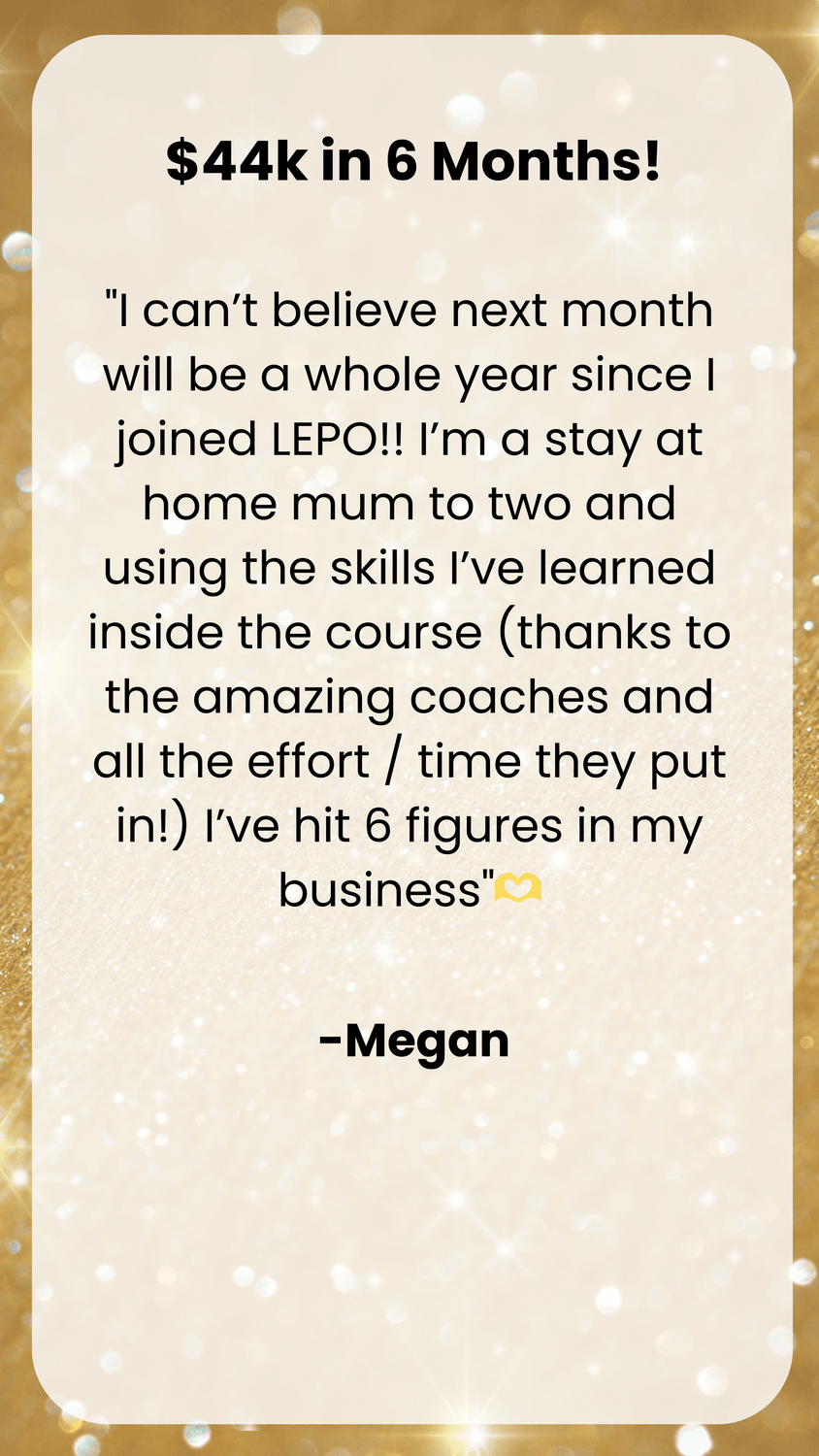 "I can’t believe next month will be a whole year since I joined LEPO!! I’m a stay at home mum to two and using the skills I’ve learned inside the course (thanks to the amazing coaches and all the effort / time they put in!) I’ve hit 6 figures in my business"🫶