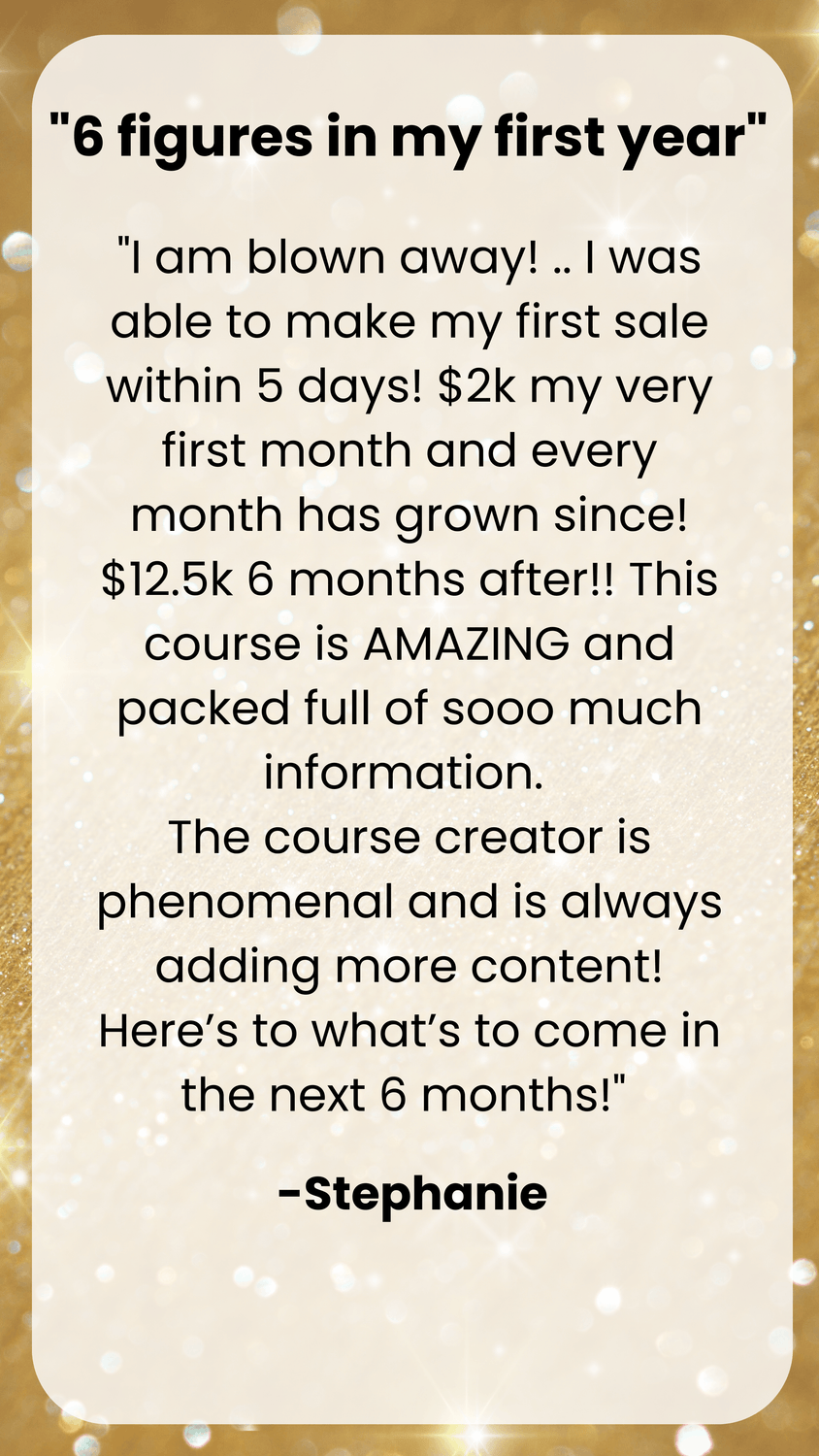 "I am blown away! .. I was able to make my first sale within 5 days! $2k my very first month and every month has grown since! $12.5k 6 months after!! This course is AMAZING and packed full of sooo much information. The course creator is phenomenal and is always adding more content! Here’s to what’s to come in the next 6 months!" 🎉